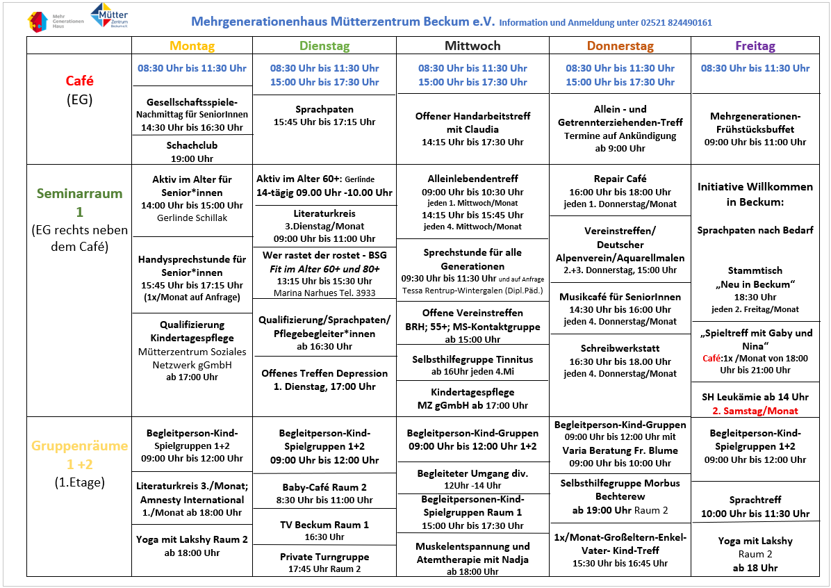 Der Verein Mütterzentrum Beckum e.V. mit dem Mehrgenerationenhaus spricht mit seiner Arbeit Menschen aller Generationen an. Er arbeitet bedarfsorientiert und niedrigschwellig, so dass jede(r) die Möglichkeit hat, an den Angeboten teilzunehmen oder den offenen Treffpunkt zu nutzen.